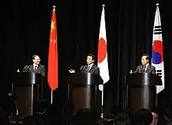 The China–Japan–South Korea trilateral summit is an annual summit meeting attended by the People's Republic of China, Japan and South Korea, three major countries in East Asia and the world's second, fourth and 12th largest economies. The first summit was held during December 2008 in Fukuoka, Japan.[1] The talks are focused on maintaining strong trilateral relations,[2] the regional economy[3][4] and disaster relief.[5]