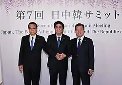 The 7th trilateral summit was held on 9 May 2018 in Tokyo, resuming the summit since 2015.[20] Japanese Prime Minister Shinzo Abe, Premier of the State Council of the People's Republic of China Li Keqiang and South Korean President Moon Jae-in attended the meeting. During his visit to Japan, Li will also attend the 40th anniversary of the conclusion of the Treaty of Peace and Friendship between Japan and China and the "Sino-Japanese Governors' Forum".[21]