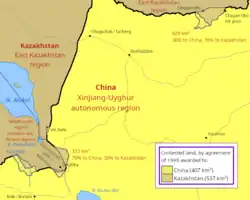 6. ^ See the text of the "Agreement between the Republic of Kazakhstan and the People's Republic of China on the Kazakhstan-China international border, signed in Almaty on Aprel 26, 1994" in О ратификации Соглашения между Республикой Казахстан и Китайской Народной Республикой о казахстанско-китайской государственной границе. Указ Президента Республики Казахстан от 15 июня 1995 г. N 2331. The border shown on Google Maps follows the description in the treaty; specifically, border point 38 described in the text is at the border line's crossing with the Terekty River (铁列克提河,Tielieketi he) can be seen at 45°37′00″N 82°15′30″E / 45.61667°N 82.25833°E / 45.61667; 82.25833. The 1969-era Soviet claim in the area can be seen on the period's topo maps, e.g. border point No. 40 on this map.