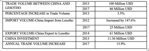 Lesotho is in a trade deficit with China. Between 2002 and 2009 China restricted imports to fewer than two million compared to the 51 million Lesotho imported.[1] In 2004 “Chinese export of clothing and textile products from Lesotho to the world stood at US$ 494,155,000”.[5] This increasing import level into Lesotho from China is positive for local low-income consumers as it reduces cost and increases variability of goods and services. It is important to note however that for the economy this is a detriment.