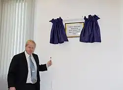 After conversion to academy status the school underwent various building and renovation projects. During the summer holidays of 2012 the school driveway was renovated with the inclusion of gates and railings to separate students from the road. The new gates were designed by pupils through a competition run by the school.[95] The following academic year the windows in the main building were all replaced with double glazing to improve efficiency and comfort. In 2013 the school bought the BMW Group Pavilion Building, which stood in the 2012 London Olympic Park, for £1. The building became the new site for the Sixth Form and Marlborough Special Needs School, as well as the Business, Economics and Psychology departments.[96] Construction of the building began in the summer of 2014 and it was officially opened on 3 March 2016 by Mayor of London Boris Johnson.[97] After opening the building the old study centre was converted into the Learning Support Room. The library was also closed, with the study area being converted to a classroom, and the library being refurbished with new furniture.