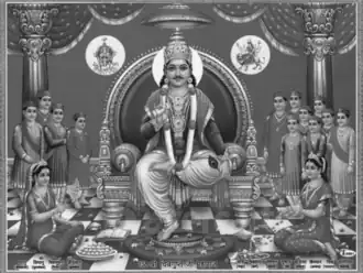 In Hindu texts and traditions, they are described to have descended from the Hindu god Chitragupta[2][3][4] who is usually depicted carrying "a flowing notebook, a pen and an inkpot" engaged in writing down human deeds.[5] They are further divided into twelve § Subgroups, each of which is claimed to be the progeny of Chitragupta's two consorts.[6][7]