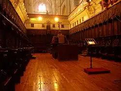 A choir, also sometimes called quire,[1] is the area of a church or cathedral that provides seating for the clergy and church choir. It is in the western part of the chancel, between the nave and the sanctuary, which houses the altar and Church tabernacle. In larger medieval churches it contained choir-stalls, seating aligned with the side of the church, so at right-angles to the seating for the congregation in the nave. Smaller medieval churches may not have a choir in the architectural sense at all, and they are often lacking in churches built by all denominations after the Protestant Reformation, though the Gothic Revival revived them as a distinct feature.
