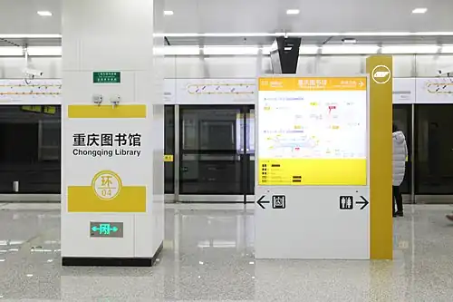 Chongqing Library station (simplified Chinese: 重庆图书馆站; traditional Chinese: 重慶圖書館站) is a station on Loop Line of Chongqing Rail Transit in Chongqing Municipality, China.[1][2] It is located in the Shapingba District. The original name of the station was Fengtianlu. It opened in 2018. Until the remaining section opened in January 2021, it served as the terminus of Loop Line in Phase I.