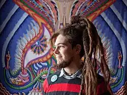 Born in Ottawa, Ontario, Canada, Dyer moved to Lima, Peru at age 4. Dyer started skateboarding at 8 years old, and later started to surf at 12. By 14 years old he joined a soccer fan based street gang called "SepUlcro", who were fans of the Universitario de Deportes.[8] Dyer' parents sent him to Canada to study in 1996, at age 17. He lived in Ottawa with his grandmother, where he attended Heritage College and University of Ottawa and during those years he was a heavy drinker and was very self-destructive.[9] He moved to Montreal in 2000 to study Illustration at Dawson College. In the summer of 2001 he went tree planting, which directed Dyer towards a pursuit of a much more spiritual path.[10] Later in life Dyer studied under (and later taught alongside) visionary masters, including Alex Grey, Robert Venosa, Martina Hoffman, Laurence Caruana, A. Andrew Gonzales, Maura Holden, and Amanda Sage. Traveling is a big part of Dyer' explorative lifestyle, having visited over 40 countries to paint street murals, live paint at festivals, and produce gallery shows. One of the countries where he had a solo exhibition was Belgium, where he met Valerie Lambert, whom he married in 2010, but then divorced in 2016.