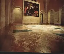 As a result of Haydon's ongoing financial troubles, the painting was sold to the firm of Childs and Inman in Philadelphia in 1831.[7] For a time it formed the nucleus of the American Gallery of Painting, erected by his cousin John Haviland of Philadelphia.[8] After being cut from its frame and dragged "like a wet blanket" from the building it was displayed in to save the painting from a fire in 1846, the painting came into the possession of Archbishop James Wood. Wood, in turn, gave it to bishop John Baptist Purcell of Cincinnati. It hung in the Cathedral Basilica of St. Peter in Chains and then was sent to the seminary of the Archdiocese of Cincinnati, Mt. St. Mary's of the West in 1929. It received a restoration by personnel of the Cincinnati Art Museum in 1941. In 1961, it was installed in the atrium of Saint Gregory Seminary, and remained there after Mt. St. Mary transferred its operations there.[9][3]