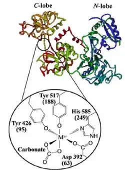 Transferrin, in addition to chromodulin has been identified as a major physiological chromium transport agent,[18][20] although a recent study found that Cr3+ in fact disables transferrin from acting as a metal ion transport agent.[21] While transferrin is highly specific for ferric ions, at normal conditions, only 30% of transferrin molecules are saturated with ferric ions, allowing for other metals, particularly those with a large charge to size ratio, to bind as well.[5][9][19] The binding sites consist of a C-lobe and an N-lobe which are nearly identical in structure.[19] Each lobe contains aspartic acid, histidine, 2 tyrosine residues and a bicarbonate ion that acts as a bidentate ligand to allow iron or other metals to bind to transferrin in a distorted octahedral geometry.[18][19][20] Evidence supporting the binding of Cr3+ to transferrin comes from extensive clinical studies that showed a positive correlation between levels of ferritin and of fasting glucose, insulin, and glycated hemoglobin (Hb1Ac) levels.[5] Furthermore, an in vivo study in rats showed that 80% of isotopically labelled Cr3+ ended up on transferrin while the rest were bound to albumin. An in vitro study showed that when chromium(III) chloride was added to isolated transferrin, the Cr3+ readily bound transferrin, owing to changes in the UV-Vis spectrum.[9][18][22] The formation constant for Cr3+ in the C-lobe is 1.41 x 1010 M−1 and 2.04 x 105 M−1 in the N-lobe, which indicates that Cr3+ preferentially binds the C-lobe.[5][18][19] Overall, the formation constant for chromium(III) is lower than that of the ferric ion.[18] The bicarbonate ligand is crucial in binding Cr3+ as when bicarbonate concentrations are very low, the binding affinity is also significantly lower.[18] Electron paramagnetic resonance (EPR) studies have shown that below pH 6, chromium(III) binds only to the N-lobe and that at near neutral pH, chromium(III) binds to the C-lobe as well.[5] Chromium(III) can compete with the ferric ion for binding to the C-lobe when the saturation greatly exceeds 30%.[19] As such, these effects are only seen in patients with hemochromatosis, an iron-storage disease characterized by excessive iron saturation in transferrin.[22]
