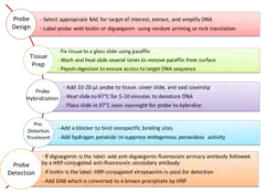 CISH probes are approximately 20 nucleotides in length and are designed for DNA targets. They are complementary to the targeted sequence and bind to it after a denaturation and hybridization step. Only a few CISH probes are available commercially, so for most applications they have to be extracted, amplified, sequenced, labelled and mapped from bacterial artificial chromosomes (BACs).[6] BACs were developed during the Human Genome Project as it was necessary to isolate and amplify short fragments of human DNA for sequencing purposes.[7] Nowadays, BACs can be selected and positioned on the human genome using public databases such as the UCSC Genome Browser.[6] This ensures optimal complementarity and sequence specificity. DNA is extracted from the BAC clones and amplified using a polymerase-based technique, such as degenerate oligonucleotide primed (DOP)-PCR.[8] Next, the clones are sequenced and their position on the genome is verified.[9] Probe labelling can be carried out by using either random priming or nick translation to incorporate biotin or digoxigenin.[10]