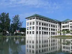 Chung Cheng High School (Main) is renowned for its lake, known as the Zhongzheng Lake. The administration building (Zhulin Building), a gazetted national monument on 10 July, 2014, has the auditorium which was the largest in the whole Southeast Asia region when it was opened.[22] The building was designed by Ho Beng Heng, an alumnus of the school. Constructed using reinforced concrete, the building features a modern functional layout displaying Chinese architectural identities such as the prominent double-tier roof with glazed Chinese tiles, and cloud and bat motifs.[5]