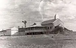 The dismantled church was railed to Birdum and then trucked the remaining distance.[5] The trucks carrying the dismantled church were caught in floods at Daly Waters and parts of the loads were left on the roadside. Spread out along the route for some time, it became known as the "longest church in Australia". While the church was reconstructed, mass was held "in the residence of some local Catholic".[6] The relocation was expensive, and by the time it was opened on 21 November 1937 by Bishop Raible[7][8][9][b] had cost "many hundreds of pounds". The church was reconstructed in a different layout that in its original location.[1] An office and verandahs were later built "on two sides to serve as accommodation for the priest".[10]