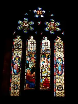 In the most westerly window on the south aisle, the right-hand light shows Elizabeth, and her son John the Baptist. Her book shows a line from the Song of Zechariah. It translates as "You, my son, shall be called the prophet of the most high." (Luke 1:68–79). The child John is looking at baby Jesus in the other window light, and he holds the words "agnus dei" or Lamb of God. The left-hand light shows the Madonna and Child, and everybody is looking at John. This window was given by parishioners in memory of Amelia Tanner, the wife of Reverend Elliston.[15][23] The three-light window on the south aisle illustrates Matthew 4.24: "And they brought unto him all sick people that were taken with divers diseases and torments." This window was given by Dinah Cautley in 1887 in memory of her husband William, a doctor of obstetrics. The Cautleys lived in the Manor House where the Cautley estate (built 1960s) now stands in Killinghall.[1][15][23] The two-light window at the east end of the south aisle was given in 1887 in memory of Mary Ann Wray by her Daughter Dinah Cautley." This window shows the Annunciation on the left, and the Resurrection on the right. It is possible that the bottom right figure is Thomas the Apostle.[1][15][23]