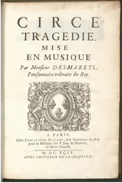 Circe was first performed on 1 October 1694[2] at the Paris Opera.[3] It was not received well; most of Desmarets' operas were said to have mimicked Lully's music in a way that produced material similar but inferior to it. No fault of Desmarets', Lully's monopoly on court music cast a shadow in which any potential individuality Desmarets had was quashed. This may have contributed to the generally negative sentiment toward his work evident in reviews written at the time.[4][5]