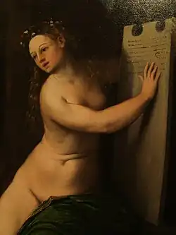 According to Robert Henry Benson, this is probably an early work painted under the inspiration of Giorgione and Titian.[1] The same critic notes that the choice and treatment of the subject suggest a sense of humour in Dossi.[1]