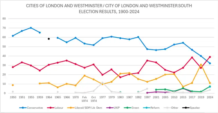 Cities of London and Westminster (known as City of London and Westminster South from 1974 to 1997) is a constituency[note 1] returning a single Member of Parliament (MP) to the House of Commons in the United Kingdom Parliament. As with all constituencies, the election is decided using the first-past-the-post system of election. Until the 2024 general election, when the constituency elected Rachel Blake, a Labour Co-op MP, the constituency had always elected the candidate nominated by the Conservative Party.[3]