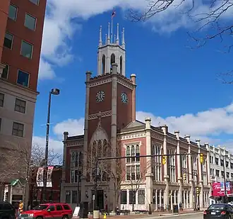 The City Hall of Manchester, New Hampshire, is located at 908 Elm Street, the city's principal commercial thoroughfare. The brick-and-granite three-story structure was built in 1844-45 to a design by Boston architect Edward Shaw, and is a prominent early example of the Gothic Revival style in a civic building. It was listed on the National Register of Historic Places in 1975.[1]