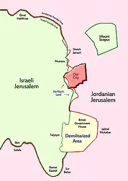 The "City Line" separating West Jerusalem (part of Israel) and East Jerusalem (part of Jordan) between 1948 and 1967. Jordan's half of Jerusalem included the Old City and the Israeli exclave of Mount Scopus. The "Demilitarized Area" surrounding the British Government House was controlled by the United Nations.