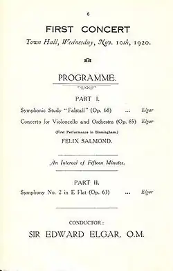 Matthews' plan was to hold eight Saturday concerts and six Wednesday concerts each year at Birmingham Town Hall, with a series of 38 concerts of more popular programmes at cheaper venues on Sundays,[27] continuing the tradition of Sunday popular classics established by his own orchestra over the previous five years.[28] The orchestra first rehearsed at 9.30am on 4 September 1920, in the band room at the Birmingham City Police's Steelhouse Lane station.[29] The CBO's first concert was given under Matthews' baton as part of the Sunday series at the Theatre Royal on 5 September 1920, with the first piece of music performed being Granville Bantock's Saul.[25] After two months of preparing the orchestra with the popular concerts,[24] the inaugural concert of the Symphony Concerts series was given at the Town Hall on 10 November 1920, with Edward Elgar conducting a concert of his own works,[28] including his Cello Concerto with Felix Salmond as the soloist. The first season continued with a remarkable series of programmes, including Ralph Vaughan Williams conducting his own London Symphony, Hamilton Harty conducting Berlioz's Symphonie fantastique, Adrian Boult conducting Rachmaninov's Second Symphony, Landon Ronald conducting Brahms' Second Symphony and Jean Sibelius conducting his own Third Symphony.[30] Two features that would become longstanding traditions for the orchestra were also established during this first year: performances of then-recent works by Holst, Vaughan Williams and Bax saw a strong representation of new music in the orchestra's programmes; and from February 1921 the orchestra's commitment to musical education was underlined with a series of concerts for city schoolchildren held in the Town Hall on Saturday afternoons.[22]