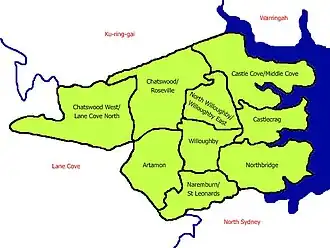 There were no wards until 1876 when the council was divided into three wards: Chatsworth Ward to the north, Middle Harbour Ward to the east and Lane Cove Ward to the west. Lane Cove Ward became the separate Municipality of Lane Cove on 11 February 1895 and Middle Harbour Ward was divided into Middle Harbour and Naremburn wards.[31] With the passing of the Municipalities Act, 1867, the name was changed to be the Borough of North Willoughby, which then changed to Borough of Willoughby in the Borough of Willoughby Naming Act 1890.[32] In June 1900, a petition to expand the number of wards from three to four, each electing three aldermen, was proclaimed dividing Chatsworth Ward into Chatswood East and West wards in addition to Middle Harbour and Naremburn wards.[33] From 28 December 1906, with the passing of the Local Government Act, 1906, the council area was renamed the Municipality of Willoughby. In August 1941, the Minister for Local Government, James McGirr, approved a proposal to split Middle Harbour Ward, adding Northbridge Ward as the fifth ward electing three aldermen.[34]