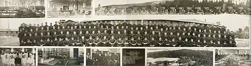 The company organization of each camp had a dual-authority supervisory staff: firstly, Department of War personnel or Reserve officers (until July 1, 1939), a "company commander" and junior officer, who were responsible for overall camp operation, logistics, education and training; and secondly, ten to fourteen technical service civilians, including a camp "superintendent" and "foreman", employed by either the Departments of Interior or Agriculture, responsible for the particular fieldwork. Also included in camp operation were several non-technical supervisor LEMs, who provided knowledge of the work at hand, "lay of the land," and paternal guidance for inexperienced enrollees.[26][27] Enrollees were organized into work detail units called "sections" of 25 men each, according to the barracks they resided in.[28] Each section had an enrollee "senior leader" and "assistant leader" who were accountable for the men at work and in the barracks.
