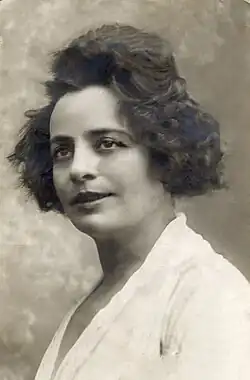 According to scholar Nina Warnke, Young became "the most beloved Yiddish actress in Poland and Russia during the 1910s" – popular not only among Yiddish-speaking operetta audiences but also among non-Jewish Poles and Russians.[2] Yiddish intellectuals and literati in Warsaw, including critics A. Mukdoyni (pseudonym of Alexander Kappel), Noach Prilutski, Dovid Frishman, and I. L. Peretz, held her acting in high esteem, despite their general ambivalence about the influx of American plays and actors into Europe at that time.[3] Although not all of the plays in her repertoire were set in the United States, she cultivated a profile of an American playing American characters.[4] Young's husband Boas, in his memoir Mayn Lebn (1950), recalled the broad appeal of the musical Di amerikanerin among Warsaw's diverse Jewish population: