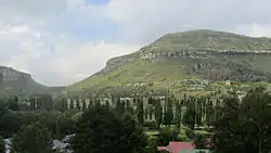 Clarens is part of the scenic Highlands Route and is surrounded by mountains. The Rooiberge is the range encompassing the village, while further towards the southeast are the Maluti mountains in shades of purple and blue. All around are the sandstone cliffs with their multi-coloured layers - these horizontal strata are a characteristic feature of the area. Many homes in the Clarens Valley are made from or clad in sandstone.