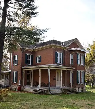 The Clark House is a historic building located in Iowa City, Iowa, United States. This property was originally part of Plum Grove, the estate of Iowa's first Territorial Governor, Robert Lucas. This lot was eventually sold to Florence A. Clark in 1870. She was a granddaughter of Governor Lucas, and her husband, Augustus L. Clark, was a direct descendant of a signer of the Declaration of Independence, Abraham Clark.[2] Built in 1874, the house is a transitional style from the simplicity of Plum Grove to the richness of the Victorian. The 2+1⁄2-story brick Italianate has an L-shaped main block and a 1+1⁄2-story wing off the back. The main block is capped with a hip roof with gable ends and bracketed eaves. It also has a wrap-around porch. The house was listed on the National Register of Historic Places in 1996.[1]