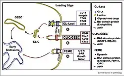 Clathrin-independent carriers (CLICs) are prevalent tubulovesicular membranes responsible for non-clathrin mediated endocytic events. They appear to endocytose material into GPI-anchored protein-enriched early endosomal compartment (GEECs). Collectively, CLICs and GEECs compose the Cdc42-mediated CLIC/GEEC endocytic pathway, which is regulated by GRAF1, as well as many others.[10][11][12]