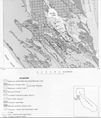 The Clear Lake Volcanic Field is a volcanic field beside Clear Lake in California's northern Coast Ranges. The site of late-Pliocene to early Holocene activity, the volcanic field consists of lava domes, cinder cones, and maars with eruptive products varying from basalt to rhyolite.[2] The site's threat level is ranked "High" at #33 in the top volcanic threats in the United States according to "2018 Update to the U.S. Geological Survey National Volcanic Threat Assessment". The last eruption was about 11,000 years ago. Cobb Mountain and Mount Konocti are the two highest peaks in the volcanic field, at 4,724 feet (1,440 m)[1] and 4,285 feet (1,306 m)[4] respectively.
