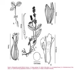 Small perennial herb, slender, stoloniferous; Stem quadrangular, numerous, tufted, erect or procumbent at the base, ascending, 8–30 cm, retrorse, pubescent; Leaves opposite, basal leaves circular-ovate, 1.2–1.5 × 1–1.1 cm, base rounded, apex obtuse, margin remotely crenate, lower and mid stem leaves ovate, 1.5–2.5 × 1–1.5 cm, papery, sub-glabrous, abaxially sparsely hispid on veins, apex obtuse, base rounded to cuneate, margin remotely dentate or crenate-serrate, petioles 0.3–1 cm; Inflorescence verticillaster,few flowered (5–10), lax or dense, crowded in short terminal raceme, floral leaves ovate-lanceolate, 0.5–1 × 0.3–0.8 cm, margin serrate, acute; Bract linear, acute, puberulous, much shorter than pedicel; Flower rose-pink, 5–7 × 3–4 mm, pedicel 1–3mm; Calyx tubular, base rounded, ca. 3–5 mm and declinate in fruit, puberulent or subglabrous, minutely hispid on veins, throat sparsely fine pilose, teeth ciliate, lower two subulate, upper three triangular, reflexed in fruit; Corolla ca. 4.5 mm, puberulent; nutlets ovoid, smooth 0.4–0.5 mm. Its flowering has been observed in July.[1]