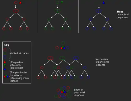 Clonality implies the state of a cell or a substance being derived from one source or the other. Thus there are terms like polyclonal—derived from many clones; oligoclonal[2]—derived from a few clones; and monoclonal—derived from one clone. These terms are most commonly used in context of antibodies or immunocytes.