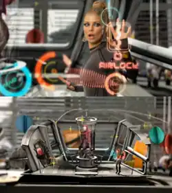 On a space shuttle, Fergie accidentally presses the airlock button (top), causing her love interest to get sucked out in space (bottom).
