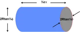 First find the magnitude of the clutter return. Assume that the clutter fills the cell containing the target, that scatterers are statistically independent and that the scatterers are uniformly distributed through the volume. The clutter volume illuminated by a pulse can be calculated from the beam widths and the pulse duration, Figure 1. If c is the speed of light and is the time duration of the transmitted pulse then the pulse returning from a target is equivalent to a physical extent of c, as is the return from any individual element of the clutter. The azimuth and elevation beamwidths, at a range , are and respectively if the illuminated cell is assumed to have an elliptical cross section.