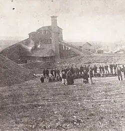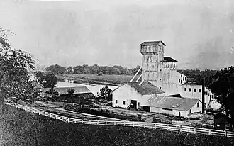 By 1865, the Jersey breaker was operated by the Delaware, Lackawanna and Western Railroad and had an estimated annual capacity of 50,000 tons.[7] In 1871, and in accordance with laws enacted following the 1869 disaster at the adjacent Avondale mine, the DL&W sank a 10-foot (3.0 m) X 14-foot (4.3 m) air shaft at the Jersey to help ventilate the mine.[33] The breaker sat on the hill just below the mine as early as 1885. The DL&W operated the Jersey until 1902, when an underground mine fire broke out. As of 1942, the DL&W's successor, the Glen Alden Coal Co., was still trying to extinguish the fire.[34]