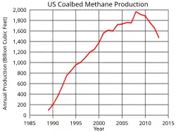The 2017 production of coalbed methane in the United States was 0.98 trillion cubic feet (TCF), 3.6 percent of all US dry gas production that year. The 2017 production was down from the peak of 1.97 TCF in 2008.[1] Most coalbed methane production came from the Rocky Mountain states of Colorado, Wyoming, and New Mexico.