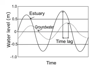 Periodic sea level changes by tides would cause a fluctuation in the groundwater level of a coastal aquifer system.[37] The tidal signal of sea tides becomes more attenuated and delayed with increasing distance to the land.[2] Water level fluctuations in the wells can be caused by the degree of connection between the ocean and the aquifer; groundwater flows well connected to the sea; alternating loading and unloading of the sea tide leads to plastic deformation.[38] Tidal efficiency of the magnitude of the oscillation of water level in a well to the oscillation of sea level is about 42% to 44%.[39] For example, if the magnitude of the oscillation of the sea level is 1 meter, the magnitude of the oscillation of water level will be 0.42 to 0.44 meter. However, the further away from the coast, the groundwater fluctuation would be lower.