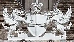 On the seal of 1381 two lions were shown supporting the arms. However, by 1609 the present supporters, two silver dragons bearing red crosses upon their wings, had been adopted.[3][4] The dragons were probably suggested by the legend of Saint George and the Dragon.[2][6]