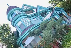 The Cockins House was designed and constructed in 1894 by James H. Bradbeer and Walter Ferris. It is 5,570 sq. ft. and built in the Queen Anne style.[1] It was created for William and Sarah Cockins who occupied the home until 1903.[2] Next, Thomas P. Newton resided at the house, staying until 1908. The house was converted to a duplex in 1911,[1] and it was rumored Charlie Chaplin stayed at the home in 1913,[3] alongside USC students. Over time, the structure fell into disrepair. Concerned neighbors nominated it for historic status; it became Los Angeles Historic-Cultural Monument No. 519 on Feb. 1, 1991.[1] The University of Southern California acquired the property and refurbished it, opening the Center for Occupation and Lifestyle Redesign in it in 1999.[1][3]