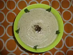 Coconut chutney is a south Indian chutney, a side-dish or a condiment,[1] common in the Indian subcontinent. The condiment is made with coconut pulp ground with other ingredients such as green chillies, tamarind, salt, coriander and water.[1] Coconut chutney is made with both red chillies or green chillies. It is served with dosas, idli, bajji, bonda, and vada.[2] In Karnataka, coconut chutney is also served with rice dishes such as pulao, puliyogare, tomato baath, and vangi baath.