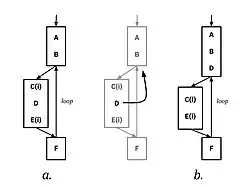 A diagram depicting loop-invariant code motion over an execution graph. This assumes that D is invariant between loop executions.