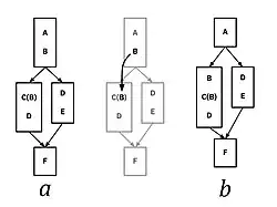 A diagram depicting an optimizing compiler removing a potentially useless call to assembly instruction "b" by sinking it to its point of use.