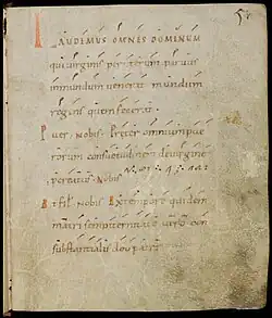 The codex begins with a trope written in Greek on the first page and a Latin versus on page 3. It is followed by one of the most extensive known collections of such tropes in the East Frankish kingdom, which were mainly used to extend the previously existing liturgic repertoires. It begins on the fourth page with the words “Incipiunt tropi carminum in diversis festivitatibus missarum canendi” (Here begin the tropes that are to be sung along the mass chants of various celebrations).[10] Many of the collected tropes are chants which were used as additions to existing ones, provided musical renditions of their texts, or which simply extended older liturgic chants. The tropes are accompanied by a musical notation in the form of neumes, an at the time novel way of melodic transcription.[11][12]