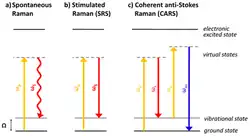 Energy diagrams of spontaneous and coherent Raman scattering processes.