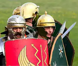 ![]() Some Roman auxiliary infantrymen (on the right, with green shields) and a legionnaire (on the left, with a red shield). | |