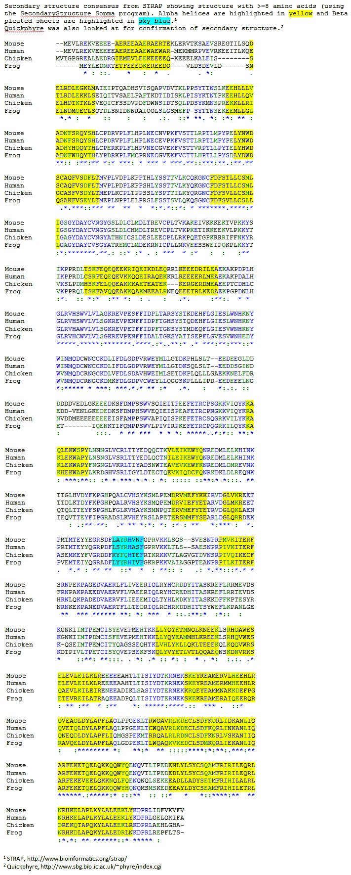 The protein has 17 predicted alpha helices sites, a characteristic of coiled-coil proteins, and 1 predicted beta-pleated sheet. The following image shows the predicted regions of alpha helices and beta pleated sheets by two programs STRAP[9] and Quickphyre:[10] Note: the consensus secondary structures are shown. This was carried out by constructing a multiple sequence alignment of the proteins with their secondary structures (as shown below). The predicted regions were then cross checked with the Quickphyre Archived 30 April 2017 at the Wayback Machine Program.