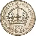 Crown (5/-) | 38.5 mm | 28.27 g | Sterling silver (92.5% silver, 7.5% copper) | Portrait of King George VI. Designed by Thomas H. Paget. | At centre the Imperial crown with the date below, "COMMONWEALTH OF AUSTRALIA" above, "ONE CROWN" below. Designed by George Kruger Gray. | 1937 | 1937–1938 | ||