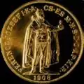 100 K | 37.0 mm | 2.0 mm | 33.9 g | 900‰ gold | "BIZALMAM AZ ŐSI ERÉNYBEN", ornament | "FERENCZ JÓZSEF I.K.A.CS. ÉS M.H.S.D.O.AP.KIR.", I. Ferenc József | "MEGKORONÁZTATÁSÁNAK NEGYVENEDIK ÉVFORDULÓJÁRA 1867-1907", coronation scene, value, mintmark | 1907 |