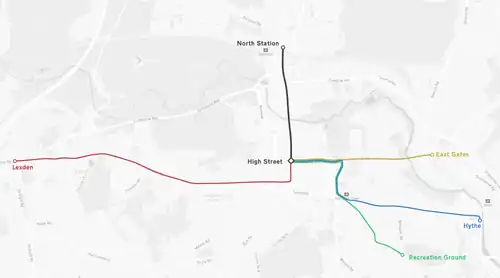 The brand new tram system consisted of three routes, all beginning at the North Station, at that time called the North Street Station. The first was to Lexden, a suburb to the west of the Town Centre via North Station Road, North Hill, Head Street then Lexden Road and Lexden Street. Up to Lexden Road, not inclusive, the route was double-tracked, from Lexden Road onwards it was single-track. The second route led to the River Colne on East Street via the double-tracked section up to the High Street, then via a double-tracked section through the High Street and onto a single-tracked section through East Hill to East Street. The third route was to Hythe, to the east of the Town Centre, via the double-tracked sections up to East Hill, where it turned onto another double-tracked section through Queen Street and St. Botolph's Street, where it became a single-track all the way to Hythe.