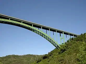 It is currently the highest arch bridge in the U.S. state of California and among the highest bridges in the United States. At its highest point, the bridge deck is 400 ft (122 m) above the canyon floor.[1][2] The bridge is also the largest steel arch bridge in the state.[3] It was determined to be eligible for the National Register of Historic Places with exceptional significance.[3]