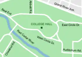The college went forward with plans to save the structurally unsound building, but it was beyond preservation. The renovation weakened the shoddily built structure, and in August 1918, the building collapsed while a marching band played "The Star-Spangled Banner" outside the building. No one was injured in the collapse. After the College cleared away the debris, they entertained several proposals to replace College Hall, but in the end they erected a clock tower on the northeast corner of the site. Beaumont Tower became the new architectural symbol of Michigan State College.[1] Nevertheless, College Hall was not forgotten; to this day it is featured on the great seal of Michigan State University.