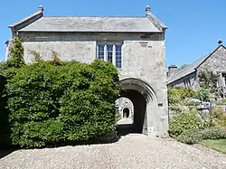 The Gatehouse is probably C15, remodelled in circa C16 or early C17, with minor alterations probably of the early C19 and was repaired in C20.[11] Formerly occupying the upper floor was a chapel dedicated to St. Edmund of Canterbury[12] (Edmund Rich (1175–1240), Archbishop of Canterbury (1233–1240), canonised 1349), licensed in 1402 by Bishop of Exeter Edmund Stafford. The building is orientated on an east-west axis, thus suited for religious usage. The former entrance was up a steep staircase on the north side.[13]
